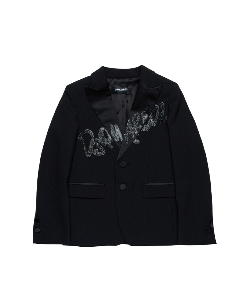 The definition of black-tie glamour. This tailored blazer is crafted from a light wool blend, styled with tonal satin peak lapels. Glittery Dsquared2 lettering adds an exclusive touch.