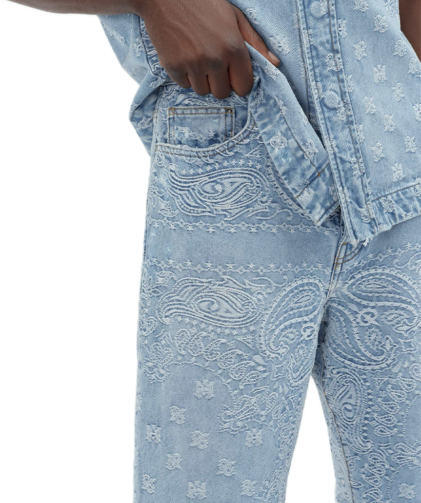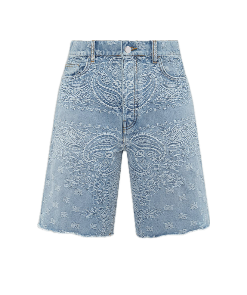 THE MA ICON AND SIGNATURE PAISLEY MOTIF COALESCE IN A RHYTHMIC SCHEME ON THESE JACQUARD WEAVE DENIM SHORTS. JOINING VISUAL CUES OF AMERICANA WITH A RENEGADE EDGE, THESE SHORTS ARE FINISHED WITH FIVE-POCKET CONSTRUCTION, RAW HEMS AND A SLIGHTLY SUN-FADED WASH TREATMENT.