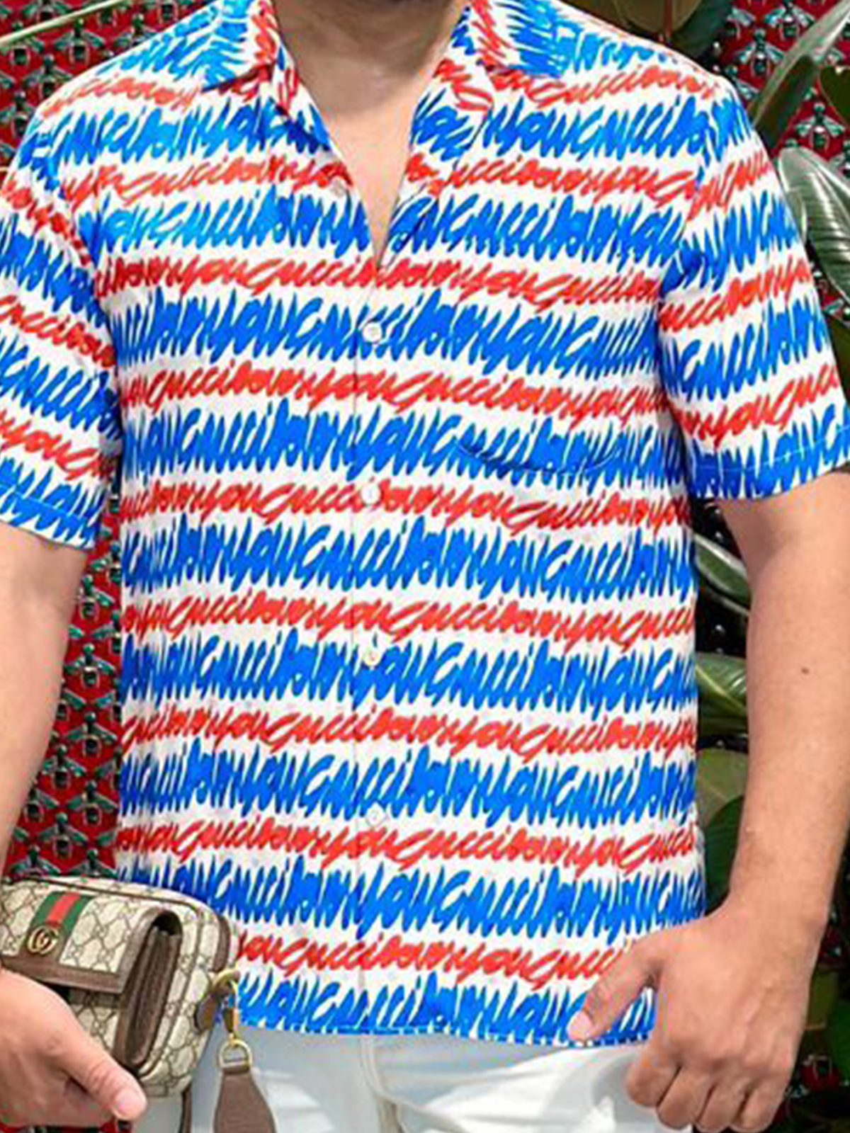 Draped in luxury, this Gucci ensemble pairs a beautifully cut silk shirt with a hint of sheerness, with meticulously tailored high-waisted pants that elongate the legs. The look is completed with a pair of statement Gucci shoes and a sophisticated handbag, exuding an air of effortless sophistication. Each piece is chosen for its ability to create a cohesive narrative of modern opulence and style.