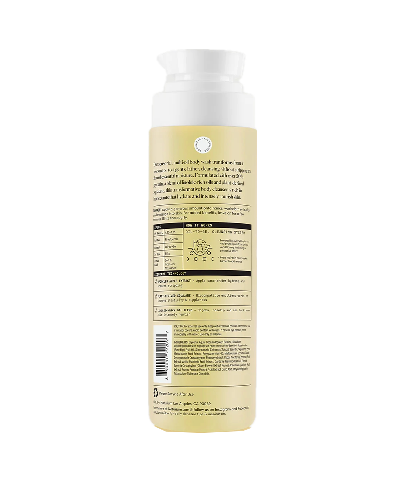 Apply a generous amount of the oil body wash onto hands, washcloth or loofah and massage into skin. For added benefits, leave on for a few minutes and Rinse thoroughly.