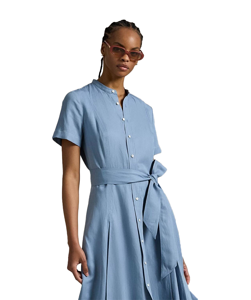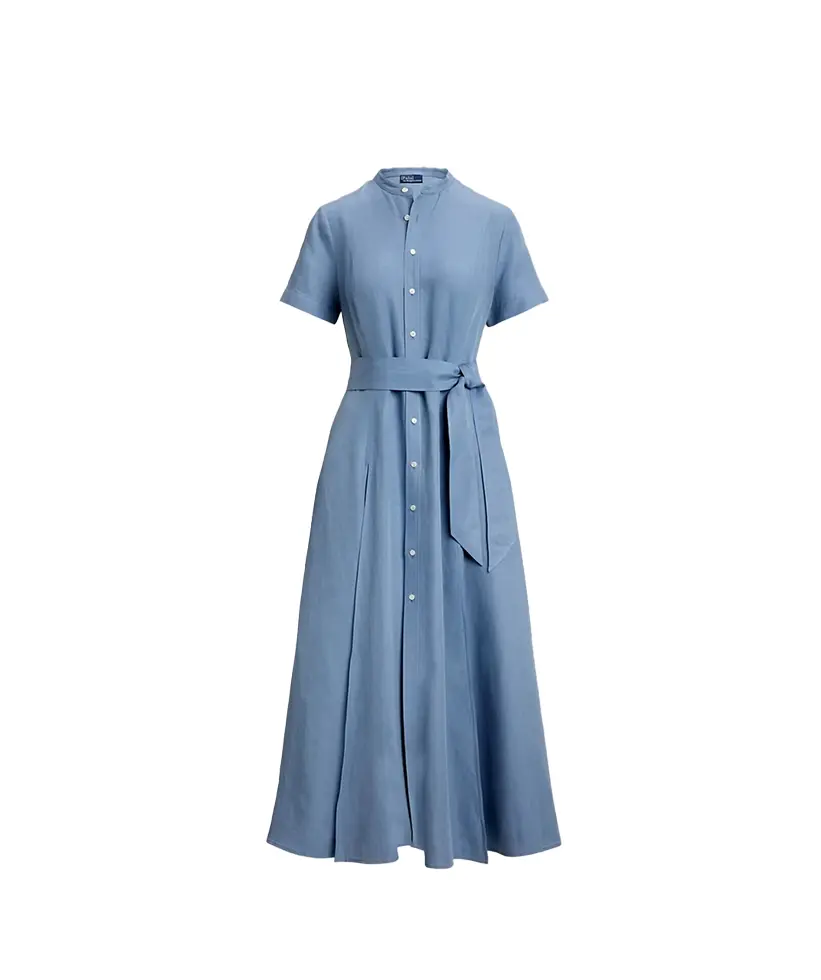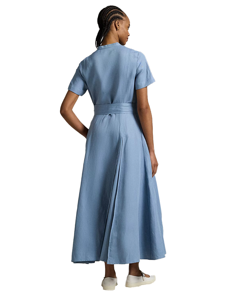 Blending silk, linen, and cotton yarns to create a soft drape and gentle structure, this version of Polo’s timeless shirtdress is designed for a sweeping A-line silhouette with inverted box pleats at the skirt for added volume.